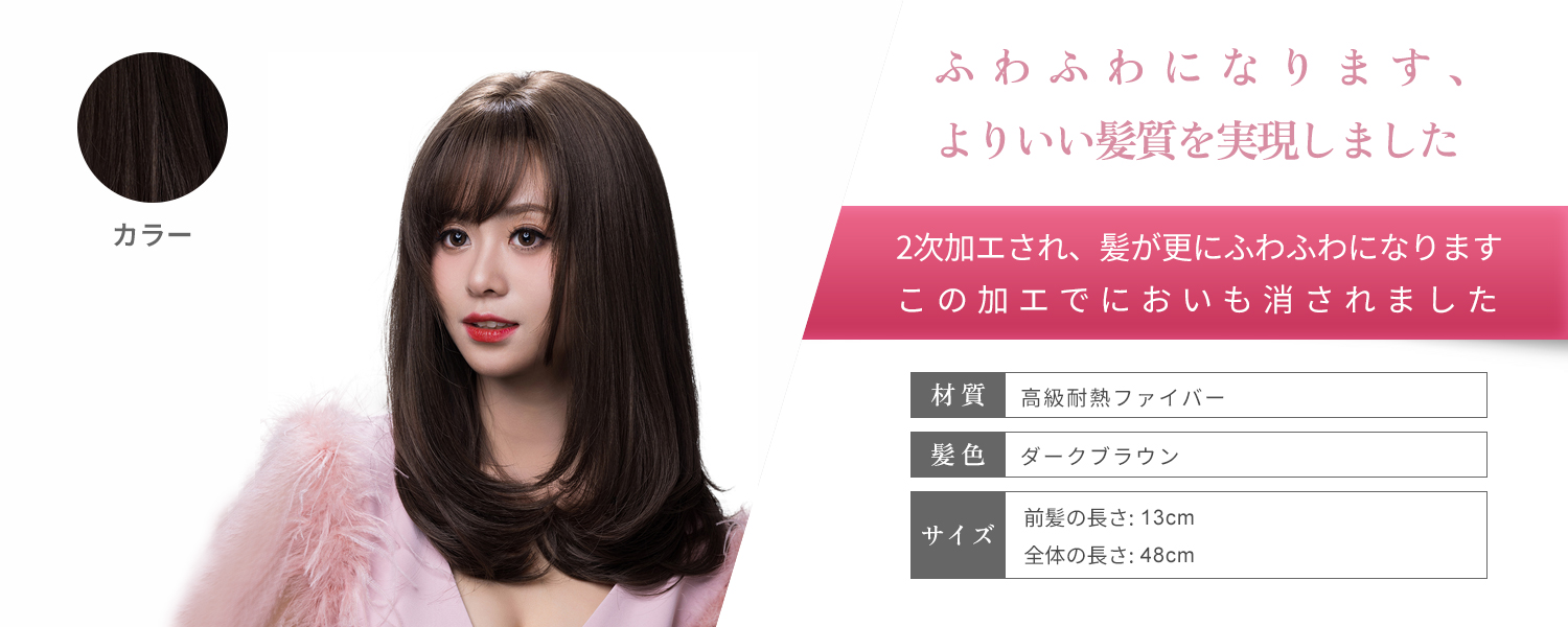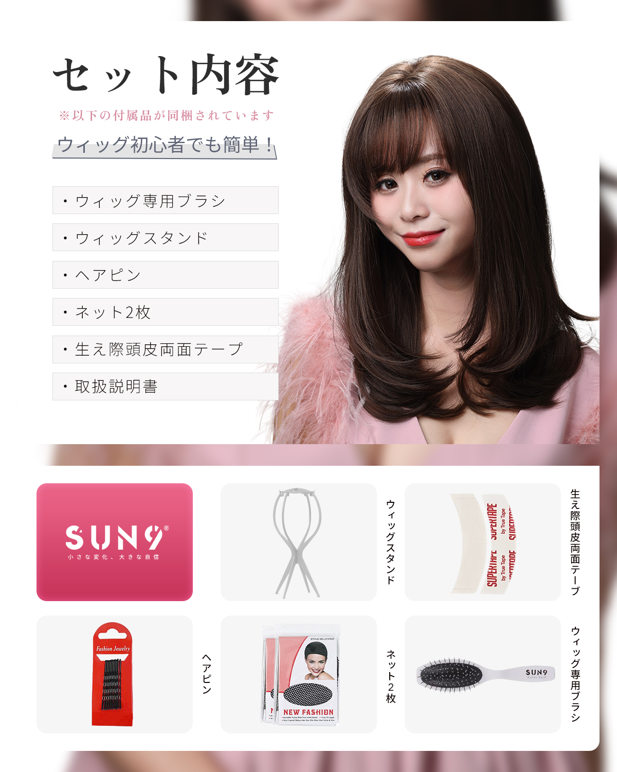 この商品について 【ウィッグへのこだわり】本格的かつ自然な仕上がりを追求。天然繊維で再現した髪の毛は自然な生え際と光沢感があり、まったく違和感のないオシャレで可愛らしいヘアスタイルを実現します。簡単スタイルチェンジで、あなたの魅力を引き出す最高のファッションウィッグ! 【ウィッグ素材】優れたファイバー使用で耐熱性があり、アイロンも使用可能(160℃まで)。小顔効果を保ちながらサラサラで絡みにくい髪質をキープ。自然に馴染み、ウィッグのスタイルが崩れにくく、着用後のスタイリングも簡単。 【シーンを問わない万能ウィッグ】様々な場面で違和感なくご使用いただけるマルチ対応ウィッグです。日常のファッションだけでなく、ハロウィン、クリスマス、お祭り、結婚式、忘年会、二次会、コスプレ、デート、旅行など、幅広いシチュエーションで活躍します。 【自然な生え際と分け目】手間をかけることにより、髪は根元からくっきりとし、柔らかで自然な動きを演出します。程よい毛量でふんわりとしたボリューム感を出しつつも、生え際と分け目がよりナチュラルに。 【軽くて通気性抜群】軽量でありながら、自然な仕上がりを実現し、長時間でも快適に過ごせる高品質ウィッグ。 【セット内容】ウィッグ本体、ウィッグ専用ブラシ、ウィッグスタンド、ヘアピン、ウィッグネット2枚、生え際頭皮両面テープ、取扱説明書。ウィッグ初心者でも届いたその日から簡単に着用できます。