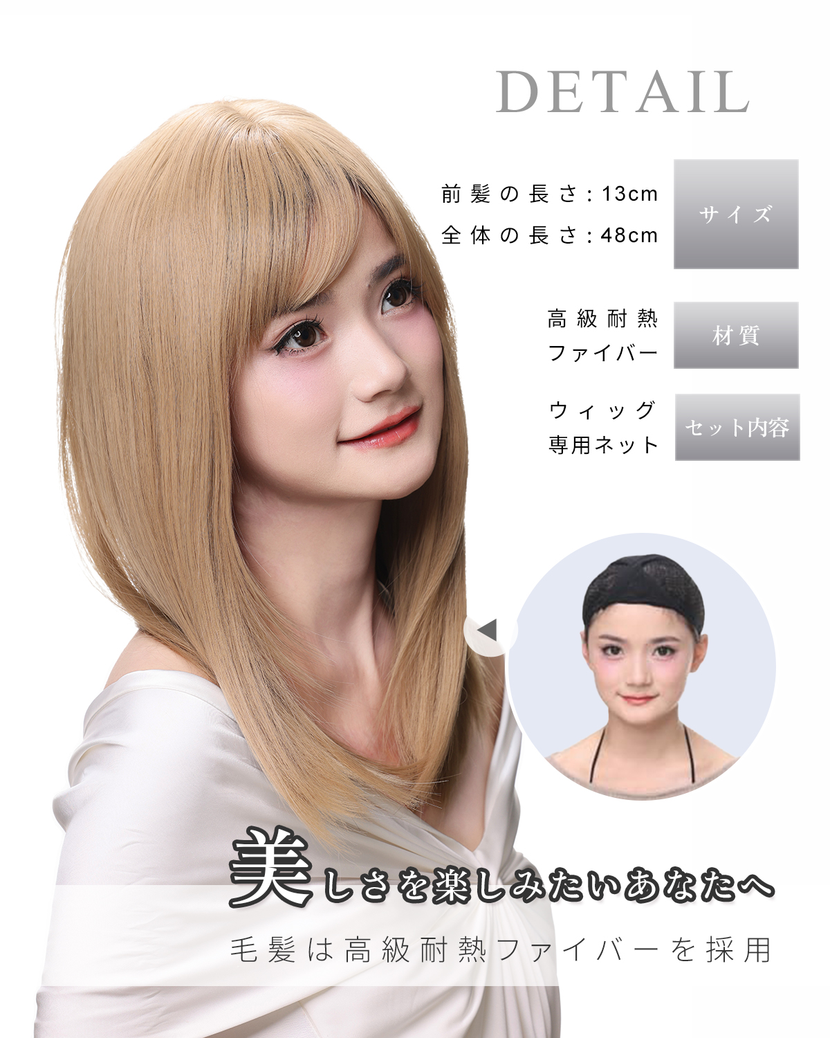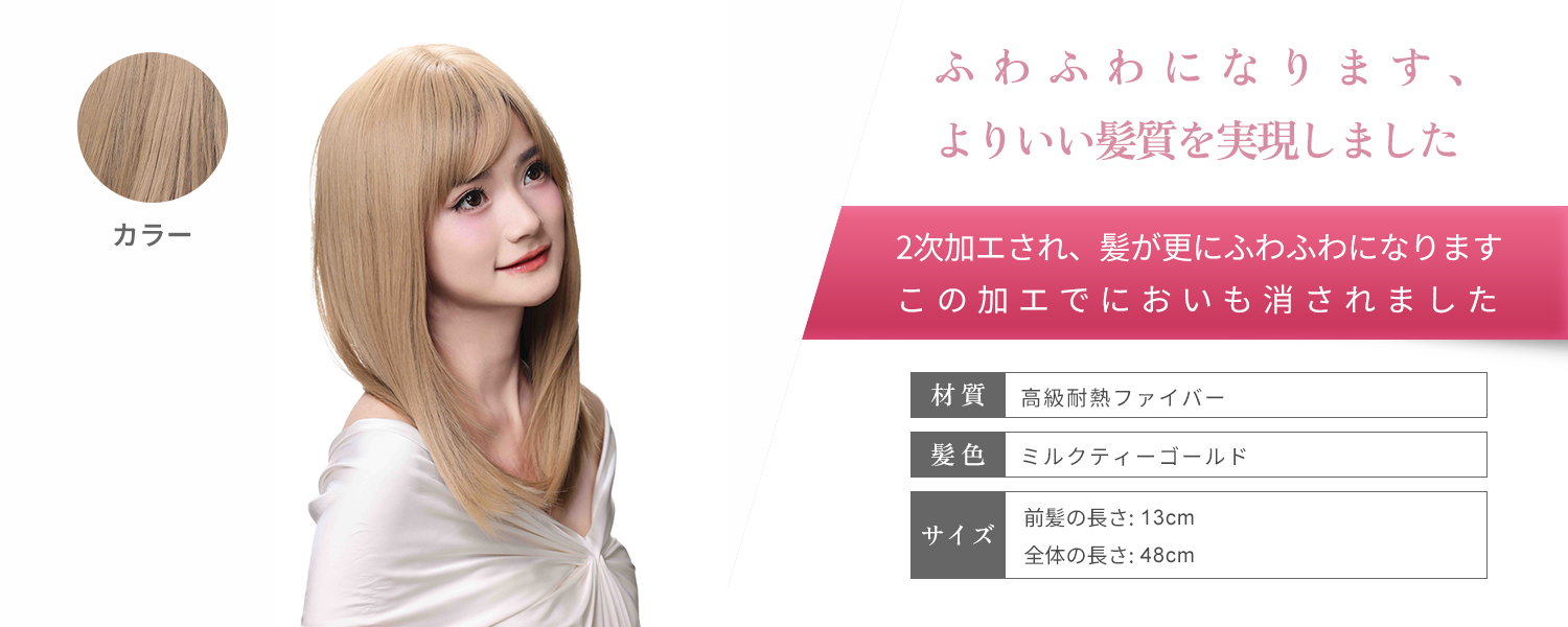この商品について 【ウィッグへのこだわり】本格的かつ自然な仕上がりを追求。天然繊維で再現した髪の毛は自然な生え際と光沢感があり、まったく違和感のないオシャレで可愛らしいヘアスタイルを実現します。簡単スタイルチェンジで、あなたの魅力を引き出す最高のファッションウィッグ! 【ウィッグ素材】優れたファイバー使用で耐熱性があり、アイロンも使用可能(160℃まで)。小顔効果を保ちながらサラサラで絡みにくい髪質をキープ。自然に馴染み、ウィッグのスタイルが崩れにくく、着用後のスタイリングも簡単。 【シーンを問わない万能ウィッグ】様々な場面で違和感なくご使用いただけるマルチ対応ウィッグです。日常のファッションだけでなく、ハロウィン、クリスマス、お祭り、結婚式、忘年会、二次会、コスプレ、デート、旅行など、幅広いシチュエーションで活躍します。 【自然な生え際と分け目】手間をかけることにより、髪は根元からくっきりとし、柔らかで自然な動きを演出します。程よい毛量でふんわりとしたボリューム感を出しつつも、生え際と分け目がよりナチュラルに。 【軽くて通気性抜群】軽量でありながら、自然な仕上がりを実現し、長時間でも快適に過ごせる高品質ウィッグ。 【セット内容】ウィッグ本体、ウィッグ専用ブラシ、ウィッグスタンド、ヘアピン、ウィッグネット2枚、生え際頭皮両面テープ、取扱説明書。ウィッグ初心者でも届いたその日から簡単に着用できます。