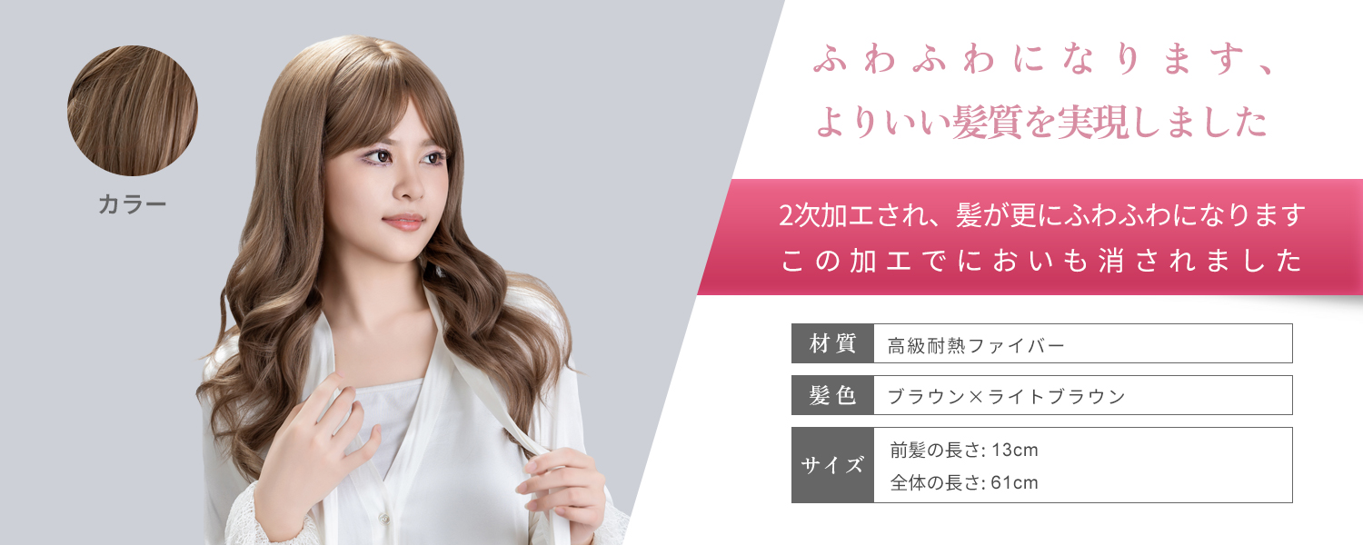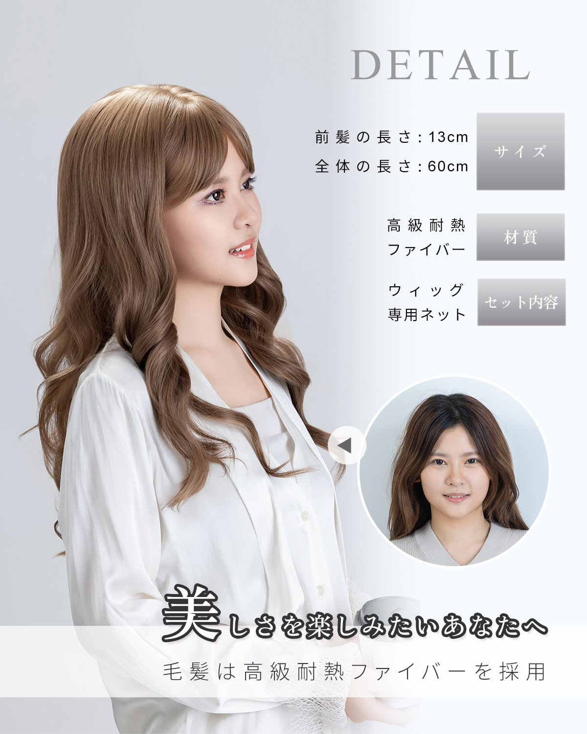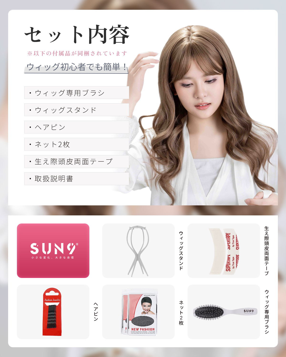 この商品について 【ウィッグへのこだわり】本格的かつ自然な仕上がりを追求。天然繊維で再現した髪の毛は自然な生え際と光沢感があり、まったく違和感のないオシャレで可愛らしいヘアスタイルを実現します。簡単スタイルチェンジで、あなたの魅力を引き出す最高のファッションウィッグ! 【ウィッグ素材】優れたファイバー使用で耐熱性があり、アイロンも使用可能(160℃まで)。小顔効果を保ちながらサラサラで絡みにくい髪質をキープ。自然に馴染み、ウィッグのスタイルが崩れにくく、着用後のスタイリングも簡単。 【シーンを問わない万能ウィッグ】様々な場面で違和感なくご使用いただけるマルチ対応ウィッグです。日常のファッションだけでなく、ハロウィン、クリスマス、お祭り、結婚式、忘年会、二次会、コスプレ、デート、旅行など、幅広いシチュエーションで活躍します。 【自然な生え際と分け目】手間をかけることにより、髪は根元からくっきりとし、柔らかで自然な動きを演出します。程よい毛量でふんわりとしたボリューム感を出しつつも、生え際と分け目がよりナチュラルに。 【軽くて通気性抜群】軽量でありながら、自然な仕上がりを実現し、長時間でも快適に過ごせる高品質ウィッグ。 【セット内容】ウィッグ本体、ウィッグ専用ブラシ、ウィッグスタンド、ヘアピン、ウィッグネット2枚、生え際頭皮両面テープ、取扱説明書。ウィッグ初心者でも届いたその日から簡単に着用できます。