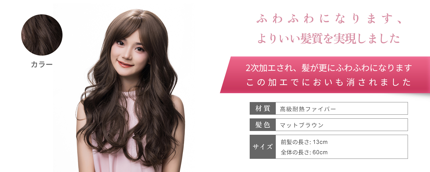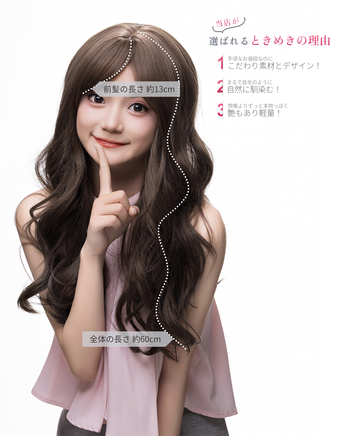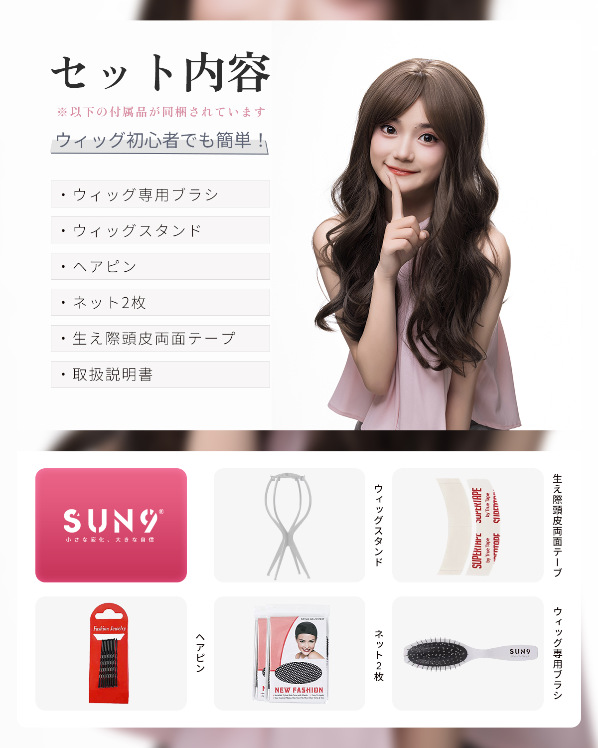 この商品について 【ウィッグへのこだわり】本格的かつ自然な仕上がりを追求。天然繊維で再現した髪の毛は自然な生え際と光沢感があり、まったく違和感のないオシャレで可愛らしいヘアスタイルを実現します。簡単スタイルチェンジで、あなたの魅力を引き出す最高のファッションウィッグ! 【ウィッグ素材】優れたファイバー使用で耐熱性があり、アイロンも使用可能(160℃まで)。小顔効果を保ちながらサラサラで絡みにくい髪質をキープ。自然に馴染み、ウィッグのスタイルが崩れにくく、着用後のスタイリングも簡単。 【シーンを問わない万能ウィッグ】様々な場面で違和感なくご使用いただけるマルチ対応ウィッグです。日常のファッションだけでなく、ハロウィン、クリスマス、お祭り、結婚式、忘年会、二次会、コスプレ、デート、旅行など、幅広いシチュエーションで活躍します。 【自然な生え際と分け目】手間をかけることにより、髪は根元からくっきりとし、柔らかで自然な動きを演出します。程よい毛量でふんわりとしたボリューム感を出しつつも、生え際と分け目がよりナチュラルに。 【軽くて通気性抜群】軽量でありながら、自然な仕上がりを実現し、長時間でも快適に過ごせる高品質ウィッグ。 【セット内容】ウィッグ本体、ウィッグ専用ブラシ、ウィッグスタンド、ヘアピン、ウィッグネット2枚、生え際頭皮両面テープ、取扱説明書。ウィッグ初心者でも届いたその日から簡単に着用できます。
