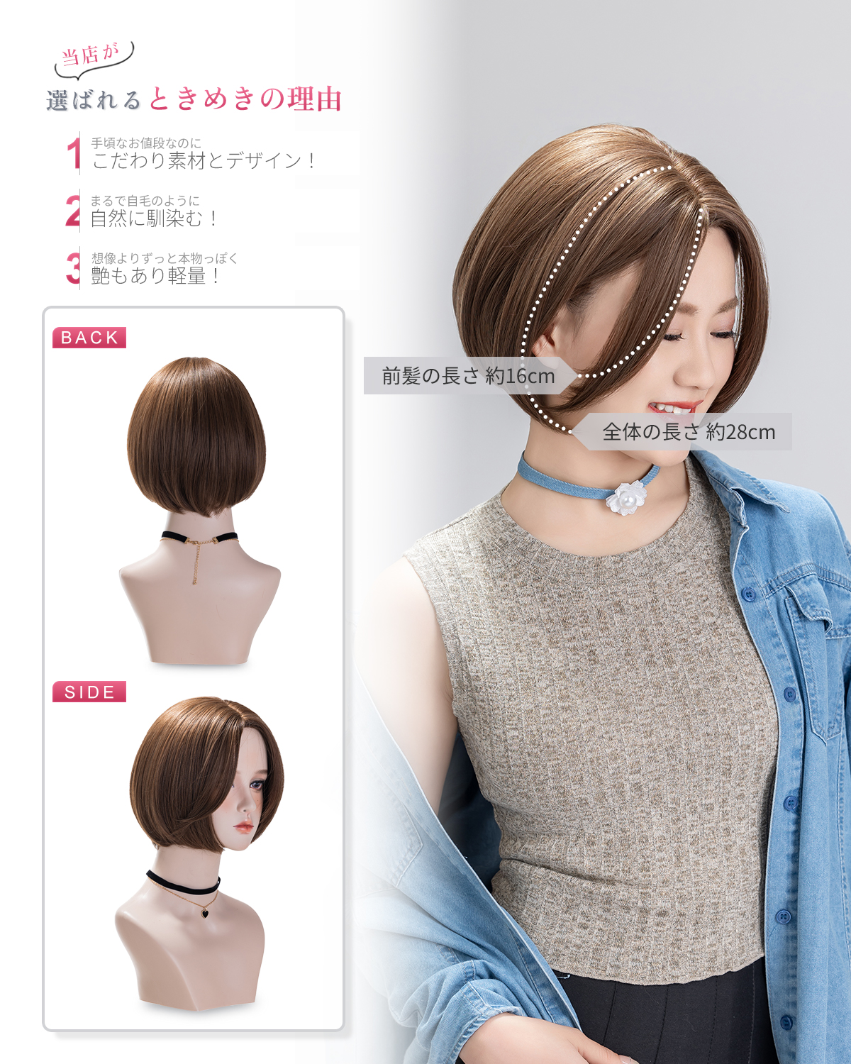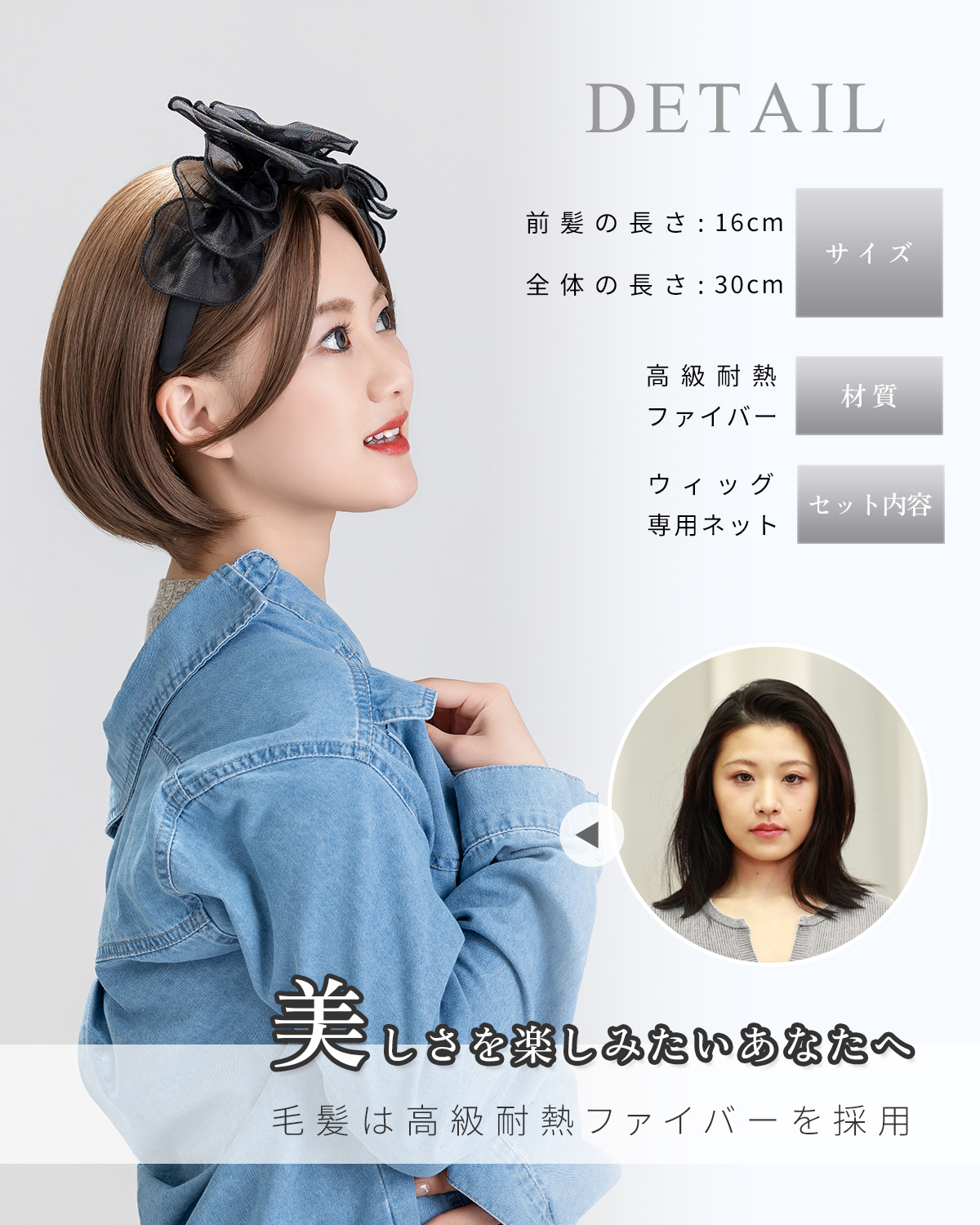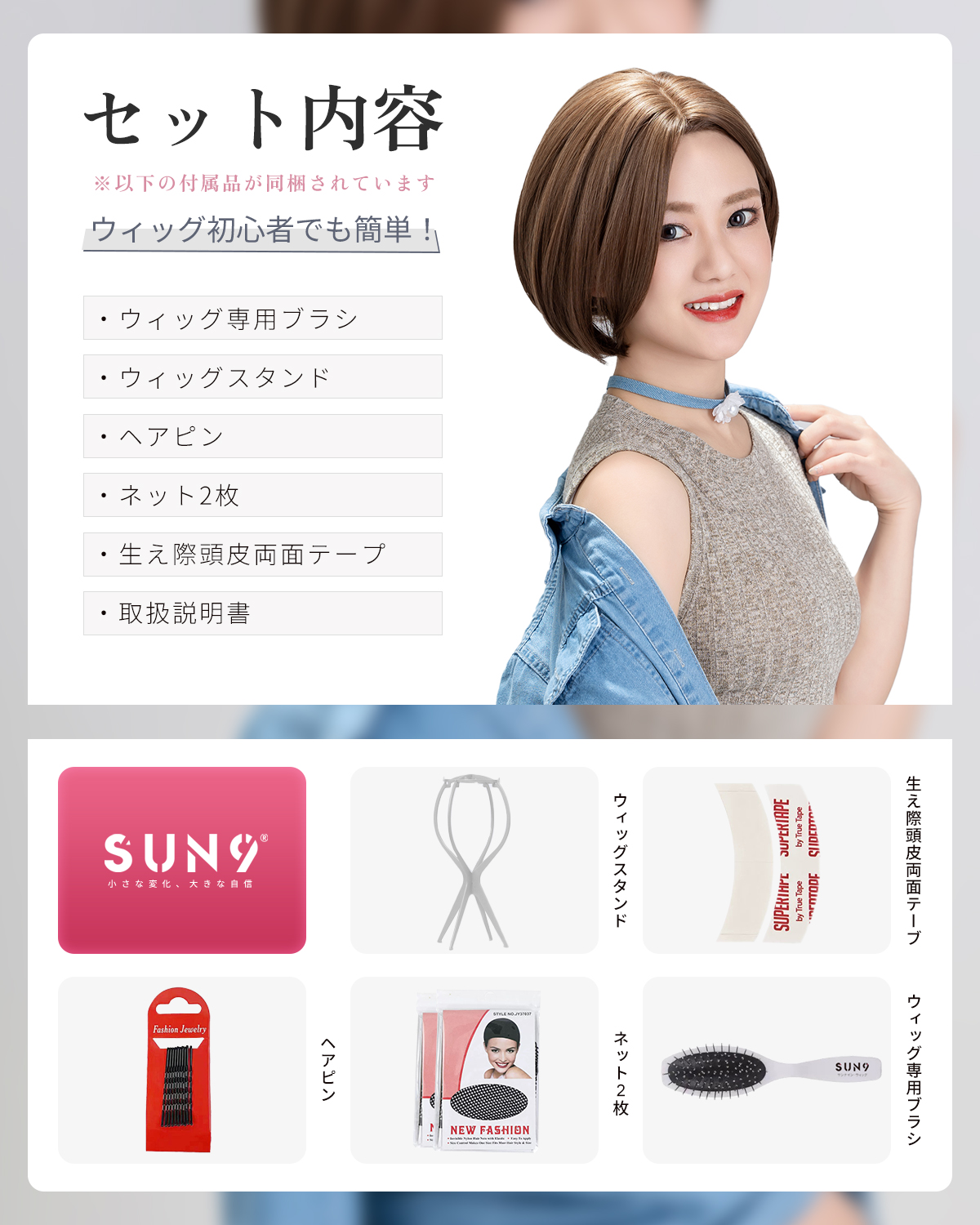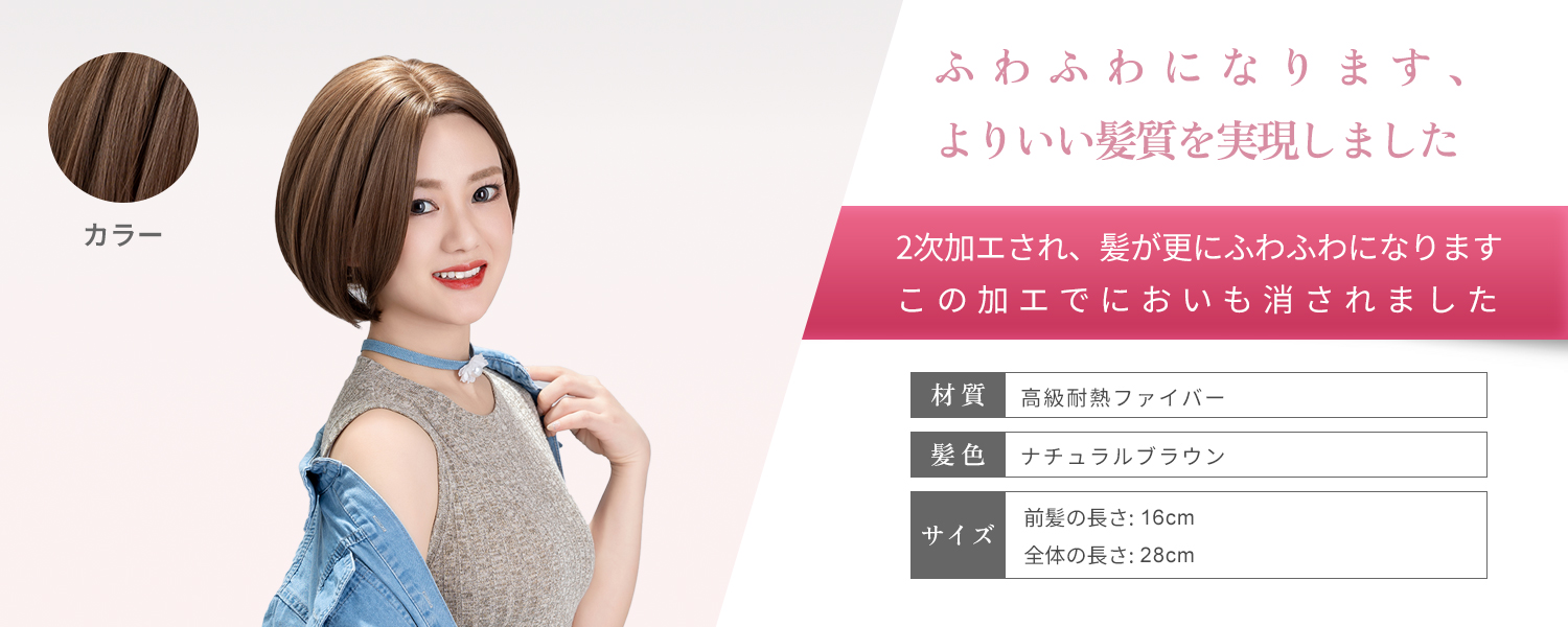 この商品について 【ウィッグへのこだわり】本格的かつ自然な仕上がりを追求。天然繊維で再現した髪の毛は自然な生え際と光沢感があり、まったく違和感のないオシャレで可愛らしいヘアスタイルを実現します。簡単スタイルチェンジで、あなたの魅力を引き出す最高のファッションウィッグ! 【ウィッグ素材】優れたファイバー使用で耐熱性があり、アイロンも使用可能(160℃まで)。小顔効果を保ちながらサラサラで絡みにくい髪質をキープ。自然に馴染み、ウィッグのスタイルが崩れにくく、着用後のスタイリングも簡単。 【シーンを問わない万能ウィッグ】様々な場面で違和感なくご使用いただけるマルチ対応ウィッグです。日常のファッションだけでなく、ハロウィン、クリスマス、お祭り、結婚式、忘年会、二次会、コスプレ、デート、旅行など、幅広いシチュエーションで活躍します。 【自然な生え際と分け目】手間をかけることにより、髪は根元からくっきりとし、柔らかで自然な動きを演出します。程よい毛量でふんわりとしたボリューム感を出しつつも、生え際と分け目がよりナチュラルに。 【軽くて通気性抜群】軽量でありながら、自然な仕上がりを実現し、長時間でも快適に過ごせる高品質ウィッグ。 【セット内容】ウィッグ本体、ウィッグ専用ブラシ、ウィッグスタンド、ヘアピン、ウィッグネット2枚、生え際頭皮両面テープ、取扱説明書。ウィッグ初心者でも届いたその日から簡単に着用できます。