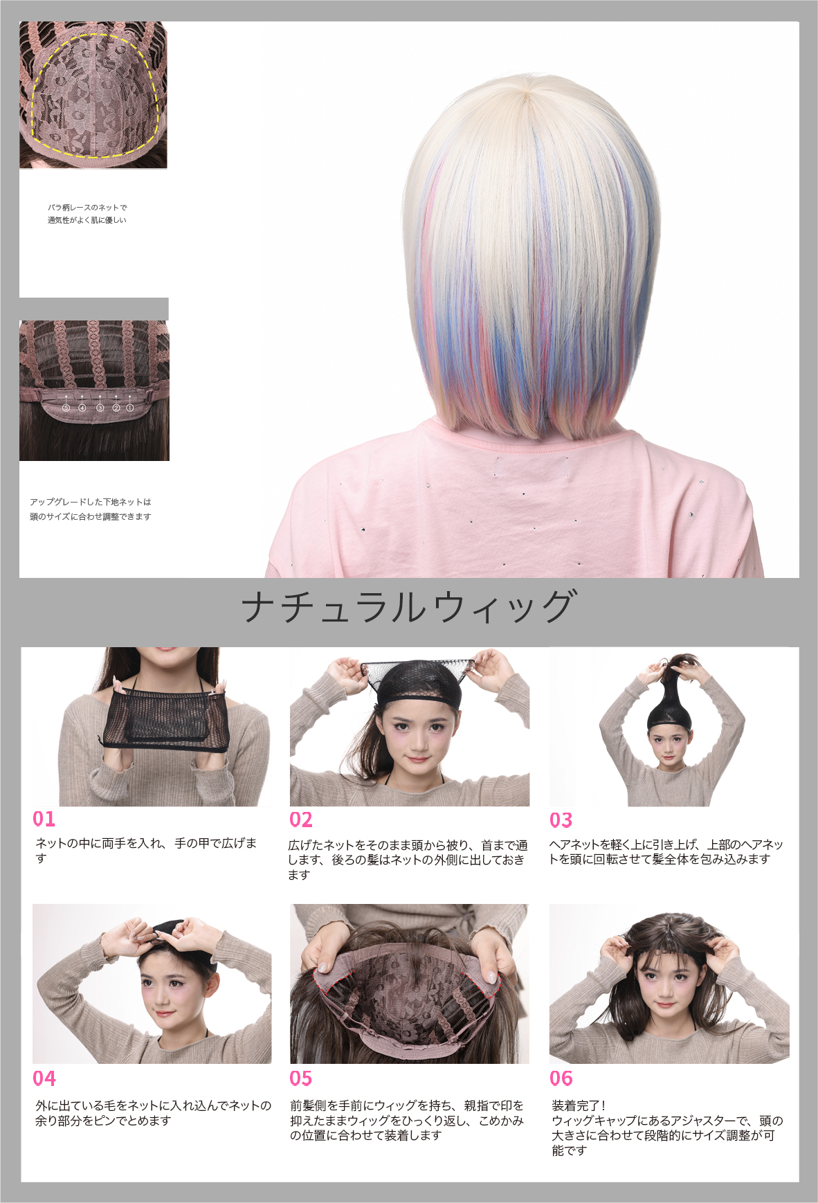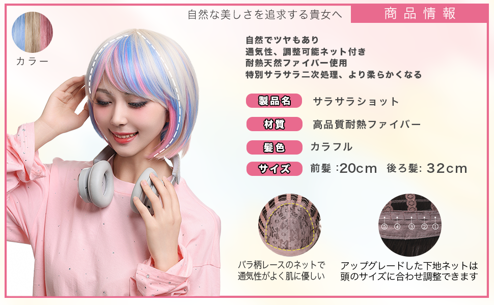 【美しさを愉しみたい貴方へ】フルトップウィッグから部分ウィッグ、前髪ヘアピースなど、さまざまなヘアスタイルに対応したウィッグの種類が豊富です。多彩なヘアカラーやロングからショートまで、その日の気分やスタイルに合わせて自由に選べます!SUN9で広がる日々の愉しさをぜひ体感してください。 【ウィッグへのこだわり】 SUN9のウィッグは、日本のトップアーティストチームが独自にデザイン開発し、プロのスタイリストによるカットを経て誕生したナチュラルウィッグです。本格的かつ自然な仕上がりを追求しました。天然繊維で再現した髪の毛は自然な生え際と光沢感があり、まったく違和感のないオシャレで可愛らしいヘアスタイルを実現します。 【ウィッグ素材】優れたファイバーでウィッグの耐熱性も抜群、コテアイロンも使用可能(160℃まで使用可能です)。品質に優れた高温ワイヤーの使用により、小顔効果を保ちながらサラサラで絡みにくい髪質をキープ。どのシチュエーションにも自然に馴染むだけでなく、ウィッグのスタイルが崩れにくく、着用前のスタイリングも簡単。ふんわり感を演出し、長時間着用していても同じスタイルをキープできる軽量なナチュラルウィッグです。 【シーンを問わない万能ウィッグ】様々な場面で違和感なくご使用いただける万能型ウィッグです。日常のファッションにも適しており、ハロウィンやクリスマス、お祭り、文化祭、忘年会、結婚式や二次会、外出、デート、パーティー、学校、会社、旅行など、幅広いシチュエーションで活躍します。初心者からファッション上級者まで、様々なスタイリングで楽しめる万能なウィッグです。【ウィッグ仕様】前髪:つむじから約14㎝、後髪つむじから約56㎝になります。 【自然な生え際】品質に優れた高温ワイヤーにより、髪全体に自然なツヤを与えます。程よい毛量でふんわりとしたボリューム感を出しつつも、生え際がよりナチュラルに。 【ふんわりウィッグ】根元からふんわりと立ち上がった前髪䛿、絶妙な抜け感を出しつつも、小顔を際立たせる自然なスタイルです。 【軽くて疲れにくい】軽量でありながら、ふんわりと自然な仕上がりを実現し、長時間の着用でも疲れにくい設計です。 【セット内容】ウィッグ本体、ウィッグ専用ブラシ、ウィッグスタンド、ヘアピン、ウィッグネット 2枚、生え際頭皮両面テープ、取扱説明書。ウィッグ初心者でも簡単に着用できます。