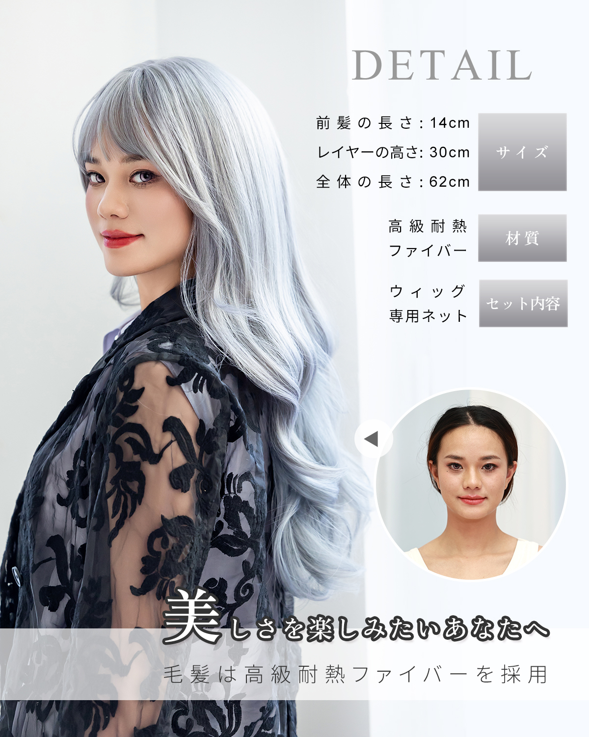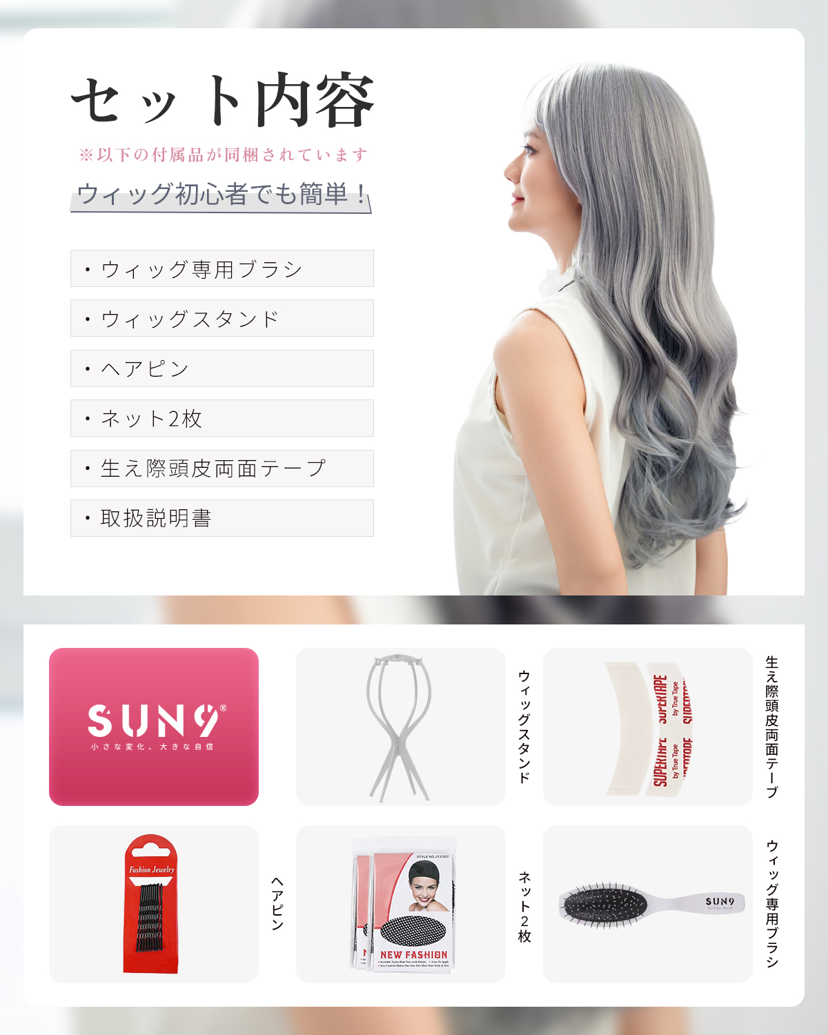 この商品について 【ウィッグへのこだわり】本格的かつ自然な仕上がりを追求。天然繊維で再現した髪の毛は自然な生え際と光沢感があり、まったく違和感のないオシャレで可愛らしいヘアスタイルを実現します。簡単スタイルチェンジで、あなたの魅力を引き出す最高のファッションウィッグ! 【ウィッグ素材】優れたファイバー使用で耐熱性があり、アイロンも使用可能(160℃まで)。小顔効果を保ちながらサラサラで絡みにくい髪質をキープ。自然に馴染み、ウィッグのスタイルが崩れにくく、着用後のスタイリングも簡単。 【シーンを問わない万能ウィッグ】様々な場面で違和感なくご使用いただけるマルチ対応ウィッグです。日常のファッションだけでなく、ハロウィン、クリスマス、お祭り、結婚式、忘年会、二次会、コスプレ、デート、旅行など、幅広いシチュエーションで活躍します。 【自然な生え際と分け目】手間をかけることにより、髪は根元からくっきりとし、柔らかで自然な動きを演出します。程よい毛量でふんわりとしたボリューム感を出しつつも、生え際と分け目がよりナチュラルに。 【軽くて通気性抜群】軽量でありながら、自然な仕上がりを実現し、長時間でも快適に過ごせる高品質ウィッグ。 【セット内容】ウィッグ本体、ウィッグ専用ブラシ、ウィッグスタンド、ヘアピン、ウィッグネット2枚、生え際頭皮両面テープ、取扱説明書。ウィッグ初心者でも届いたその日から簡単に着用できます。