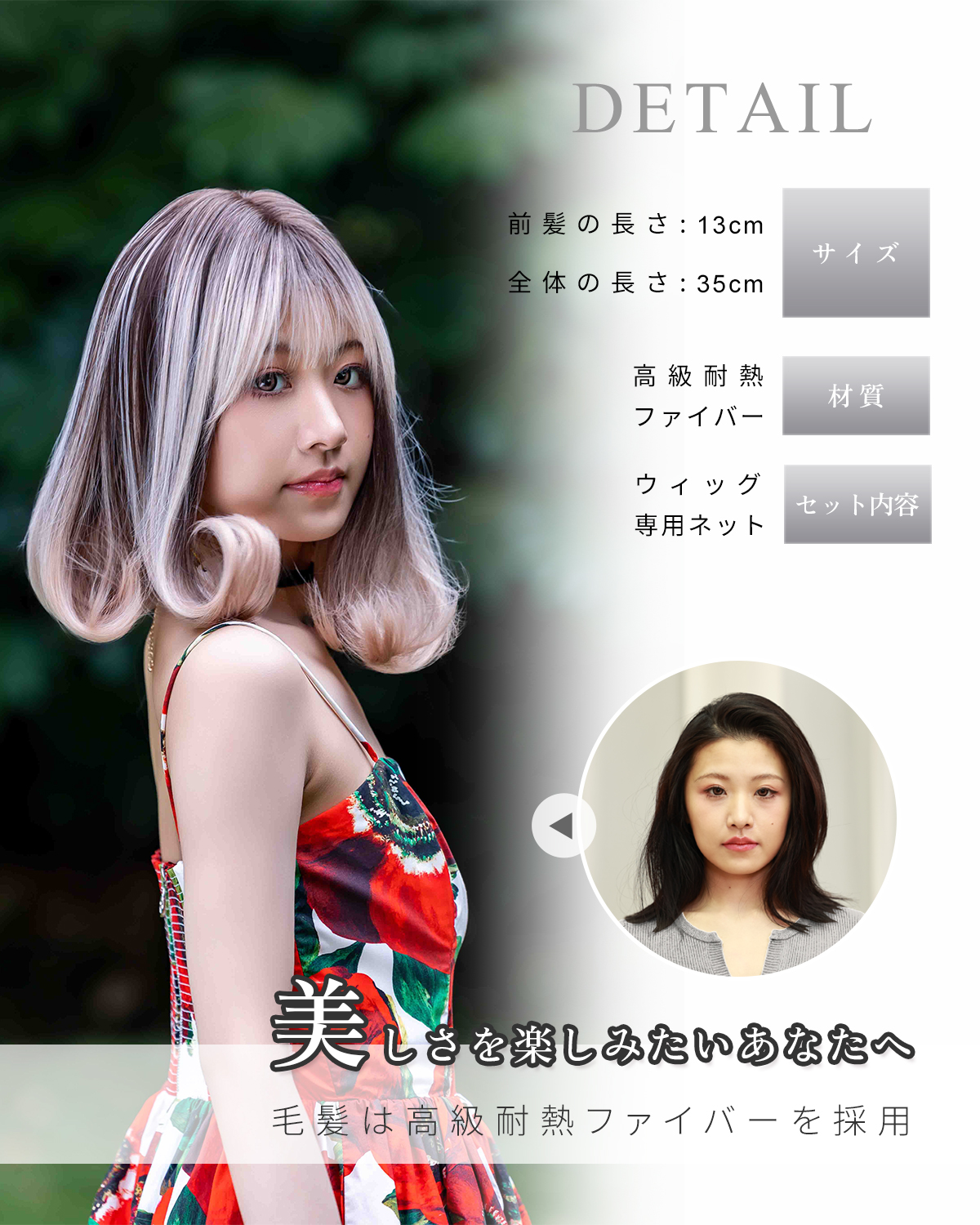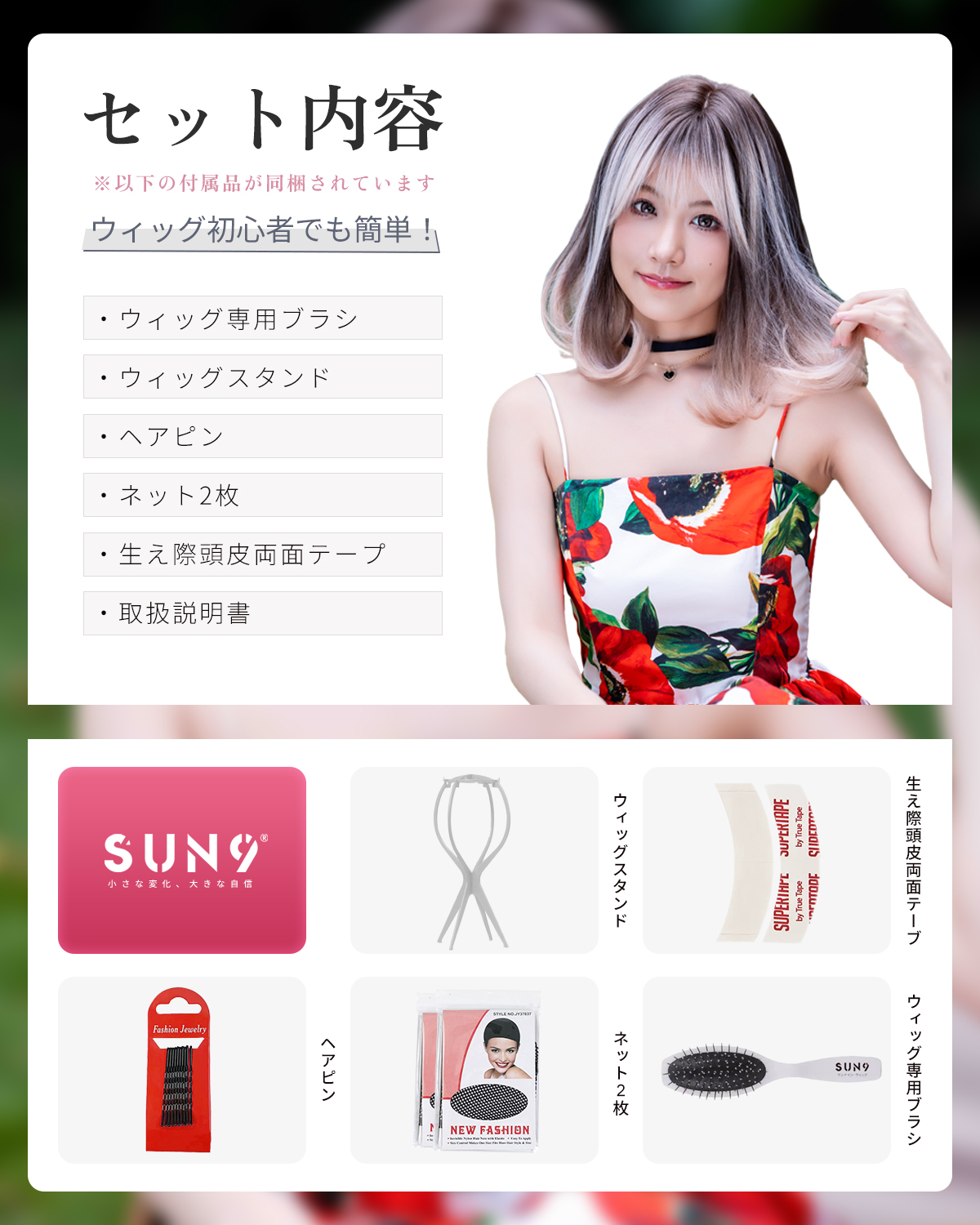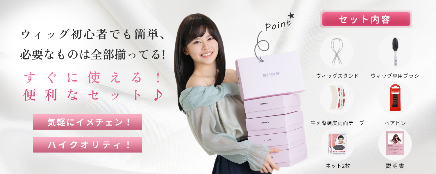 この商品について 【ウィッグへのこだわり】本格的かつ自然な仕上がりを追求。天然繊維で再現した髪の毛は自然な生え際と光沢感があり、まったく違和感のないオシャレで可愛らしいヘアスタイルを実現します。簡単スタイルチェンジで、あなたの魅力を引き出す最高のファッションウィッグ! 【ウィッグ素材】優れたファイバー使用で耐熱性があり、アイロンも使用可能(160℃まで)。小顔効果を保ちながらサラサラで絡みにくい髪質をキープ。自然に馴染み、ウィッグのスタイルが崩れにくく、着用後のスタイリングも簡単。 【シーンを問わない万能ウィッグ】様々な場面で違和感なくご使用いただけるマルチ対応ウィッグです。日常のファッションだけでなく、ハロウィン、クリスマス、お祭り、結婚式、忘年会、二次会、コスプレ、デート、旅行など、幅広いシチュエーションで活躍します。 【自然な生え際と分け目】手間をかけることにより、髪は根元からくっきりとし、柔らかで自然な動きを演出します。程よい毛量でふんわりとしたボリューム感を出しつつも、生え際と分け目がよりナチュラルに。 【軽くて通気性抜群】軽量でありながら、自然な仕上がりを実現し、長時間でも快適に過ごせる高品質ウィッグ。 【セット内容】ウィッグ本体、ウィッグ専用ブラシ、ウィッグスタンド、ヘアピン、ウィッグネット2枚、生え際頭皮両面テープ、取扱説明書。ウィッグ初心者でも届いたその日から簡単に着用できます。