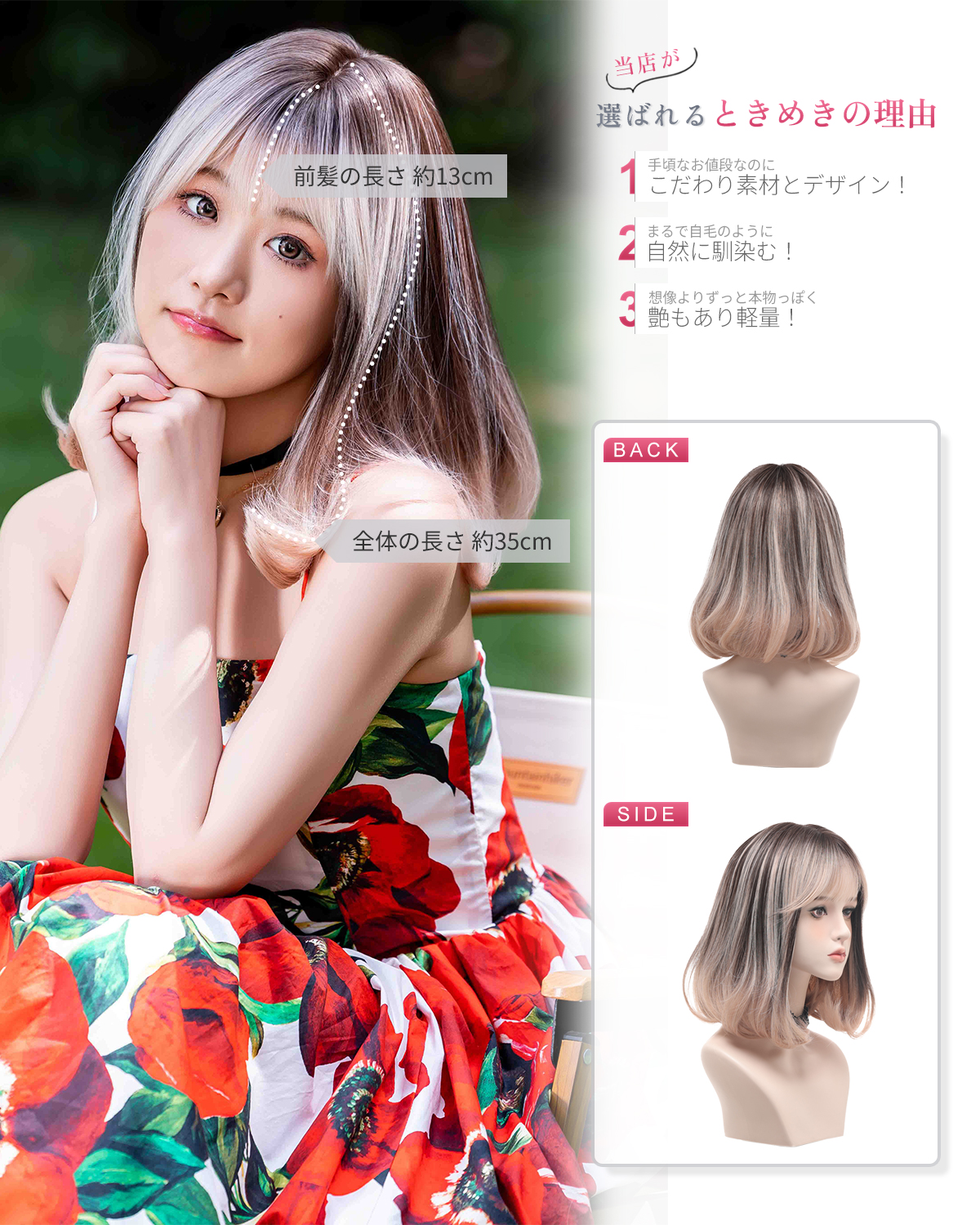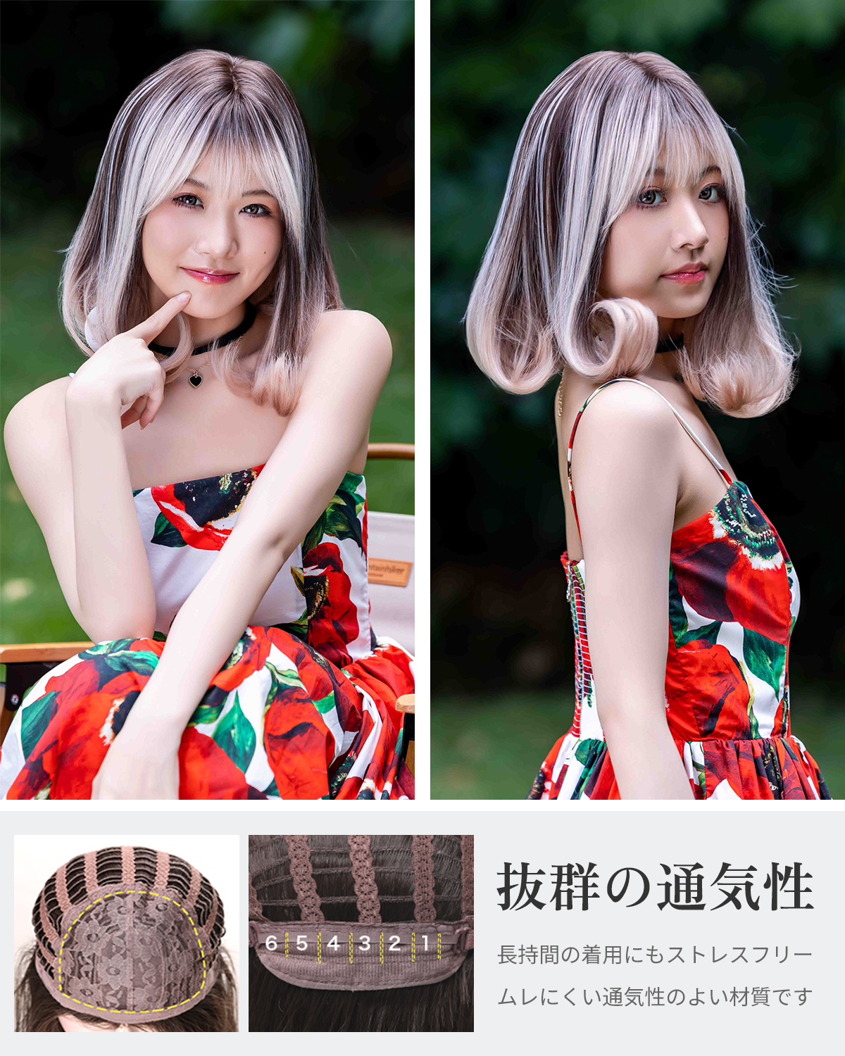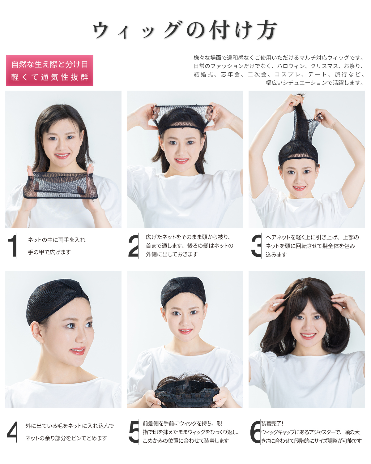 この商品について 【ウィッグへのこだわり】本格的かつ自然な仕上がりを追求。天然繊維で再現した髪の毛は自然な生え際と光沢感があり、まったく違和感のないオシャレで可愛らしいヘアスタイルを実現します。簡単スタイルチェンジで、あなたの魅力を引き出す最高のファッションウィッグ! 【ウィッグ素材】優れたファイバー使用で耐熱性があり、アイロンも使用可能(160℃まで)。小顔効果を保ちながらサラサラで絡みにくい髪質をキープ。自然に馴染み、ウィッグのスタイルが崩れにくく、着用後のスタイリングも簡単。 【シーンを問わない万能ウィッグ】様々な場面で違和感なくご使用いただけるマルチ対応ウィッグです。日常のファッションだけでなく、ハロウィン、クリスマス、お祭り、結婚式、忘年会、二次会、コスプレ、デート、旅行など、幅広いシチュエーションで活躍します。 【自然な生え際と分け目】手間をかけることにより、髪は根元からくっきりとし、柔らかで自然な動きを演出します。程よい毛量でふんわりとしたボリューム感を出しつつも、生え際と分け目がよりナチュラルに。 【軽くて通気性抜群】軽量でありながら、自然な仕上がりを実現し、長時間でも快適に過ごせる高品質ウィッグ。 【セット内容】ウィッグ本体、ウィッグ専用ブラシ、ウィッグスタンド、ヘアピン、ウィッグネット2枚、生え際頭皮両面テープ、取扱説明書。ウィッグ初心者でも届いたその日から簡単に着用できます。