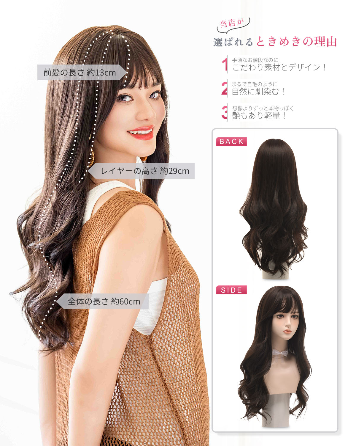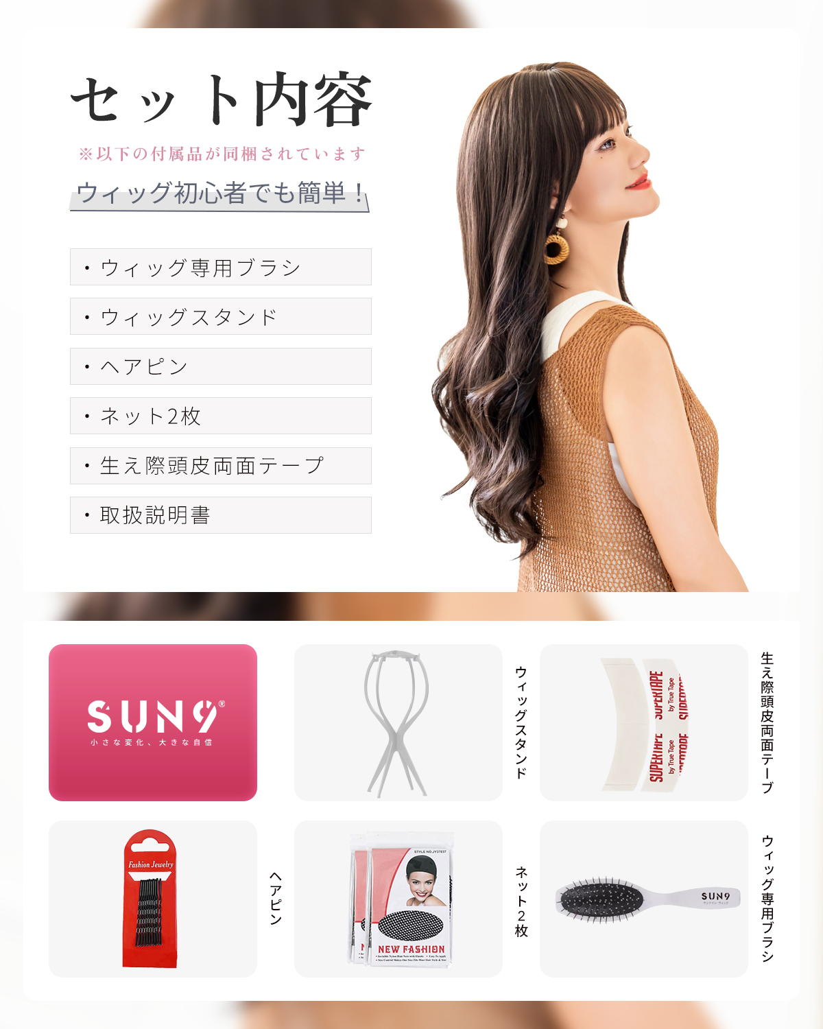 この商品について 【ウィッグへのこだわり】本格的かつ自然な仕上がりを追求。天然繊維で再現した髪の毛は自然な生え際と光沢感があり、まったく違和感のないオシャレで可愛らしいヘアスタイルを実現します。簡単スタイルチェンジで、あなたの魅力を引き出す最高のファッションウィッグ! 【ウィッグ素材】優れたファイバー使用で耐熱性があり、アイロンも使用可能(160℃まで)。小顔効果を保ちながらサラサラで絡みにくい髪質をキープ。自然に馴染み、ウィッグのスタイルが崩れにくく、着用後のスタイリングも簡単。 【シーンを問わない万能ウィッグ】様々な場面で違和感なくご使用いただけるマルチ対応ウィッグです。日常のファッションだけでなく、ハロウィン、クリスマス、お祭り、結婚式、忘年会、二次会、コスプレ、デート、旅行など、幅広いシチュエーションで活躍します。 【自然な生え際と分け目】手間をかけることにより、髪は根元からくっきりとし、柔らかで自然な動きを演出します。程よい毛量でふんわりとしたボリューム感を出しつつも、生え際と分け目がよりナチュラルに。 【軽くて通気性抜群】軽量でありながら、自然な仕上がりを実現し、長時間でも快適に過ごせる高品質ウィッグ。 【セット内容】ウィッグ本体、ウィッグ専用ブラシ、ウィッグスタンド、ヘアピン、ウィッグネット2枚、生え際頭皮両面テープ、取扱説明書。ウィッグ初心者でも届いたその日から簡単に着用できます。