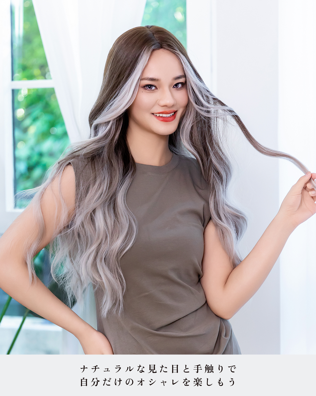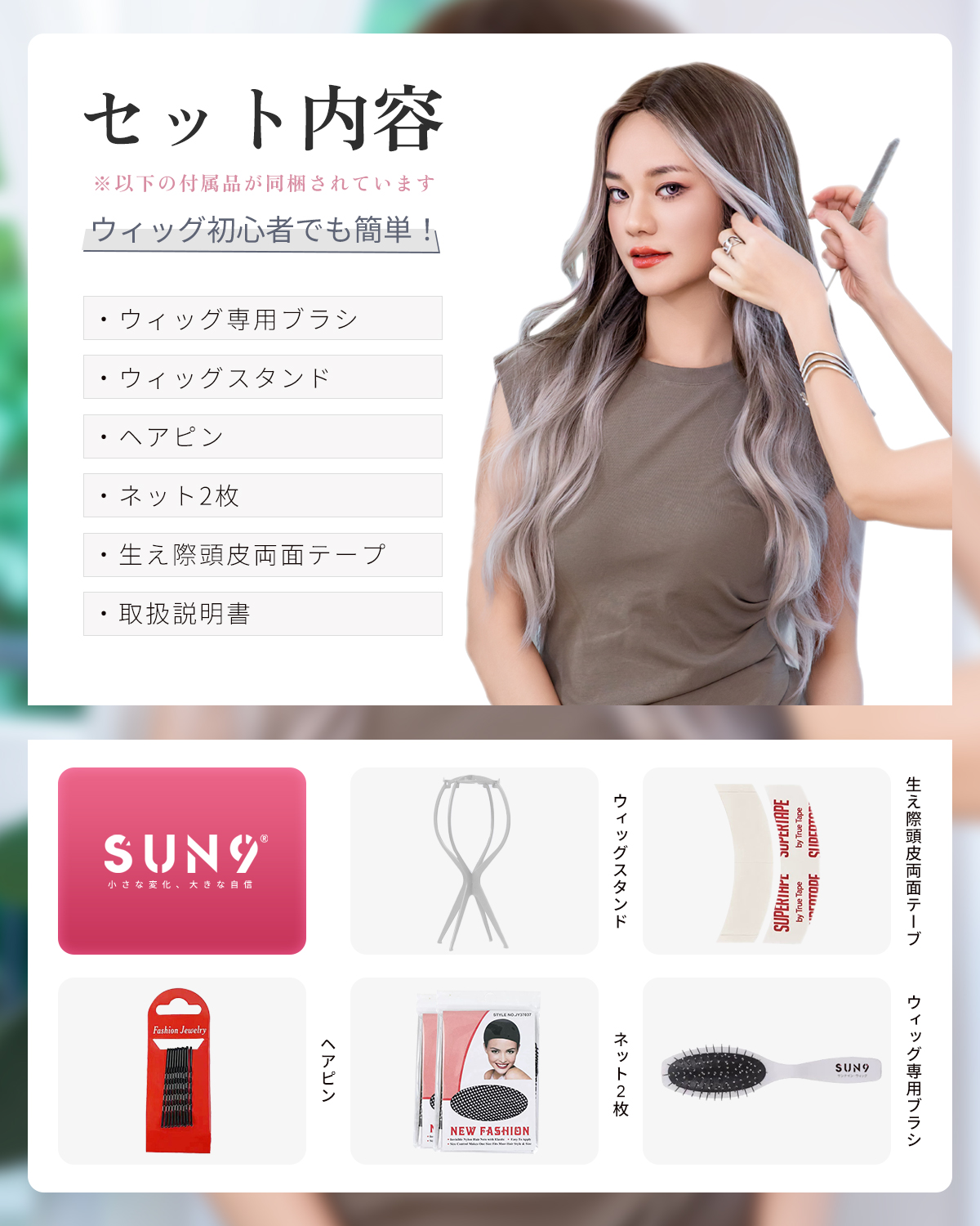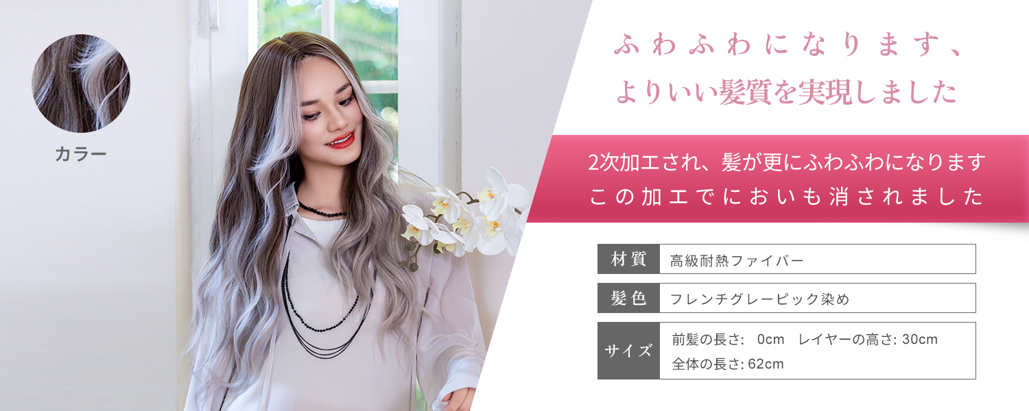 この商品について 【ウィッグへのこだわり】本格的かつ自然な仕上がりを追求。天然繊維で再現した髪の毛は自然な生え際と光沢感があり、まったく違和感のないオシャレで可愛らしいヘアスタイルを実現します。簡単スタイルチェンジで、あなたの魅力を引き出す最高のファッションウィッグ! 【ウィッグ素材】優れたファイバー使用で耐熱性があり、アイロンも使用可能(160℃まで)。小顔効果を保ちながらサラサラで絡みにくい髪質をキープ。自然に馴染み、ウィッグのスタイルが崩れにくく、着用後のスタイリングも簡単。 【シーンを問わない万能ウィッグ】様々な場面で違和感なくご使用いただけるマルチ対応ウィッグです。日常のファッションだけでなく、ハロウィン、クリスマス、お祭り、結婚式、忘年会、二次会、コスプレ、デート、旅行など、幅広いシチュエーションで活躍します。 【自然な生え際と分け目】手間をかけることにより、髪は根元からくっきりとし、柔らかで自然な動きを演出します。程よい毛量でふんわりとしたボリューム感を出しつつも、生え際と分け目がよりナチュラルに。 【軽くて通気性抜群】軽量でありながら、自然な仕上がりを実現し、長時間でも快適に過ごせる高品質ウィッグ。 【セット内容】ウィッグ本体、ウィッグ専用ブラシ、ウィッグスタンド、ヘアピン、ウィッグネット2枚、生え際頭皮両面テープ、取扱説明書。ウィッグ初心者でも届いたその日から簡単に着用できます。